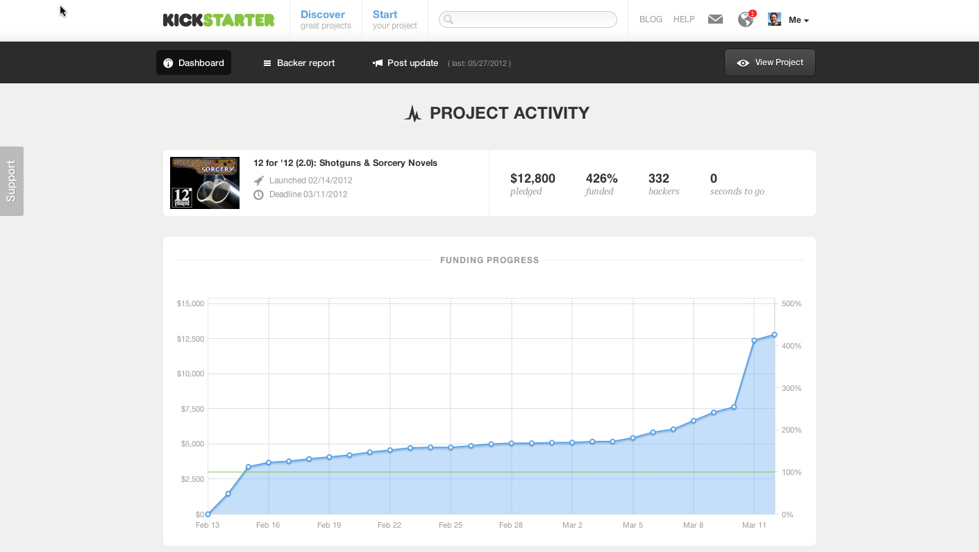 When I went to bed the night before the last day, it looked like there was no chance we’d reach that last stretch goal up to $12k. We had 205 backers who’d pledged $7,644, which wasn’t nearly enough. Up to that point, the best funding day I’d had brought in $1,961, and we were $4,346 short – more than twice that best day – with only a day left.